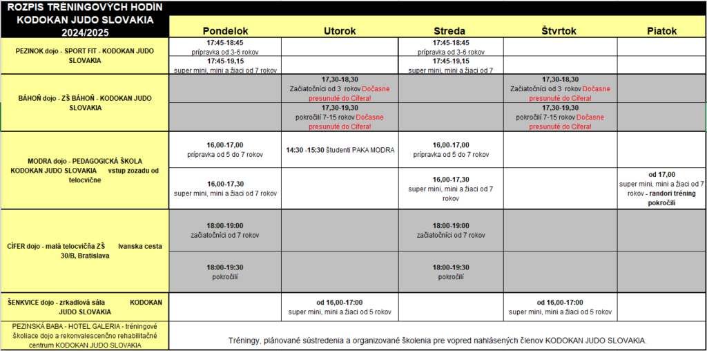 Platba 55,- Eur mesačne, alebo polročná platba 250,- Eur ( 5 mesiacov ) Možnosť navštevovať ktorékoľvek DOJO v rámci vekovej kategórie dieťaťa. Členský registračný celoročný poplatok 35,- Eur. Súrodenecká zľava 5,- Eur osoba z mesačnej a 10,- Eur z polročnej platby.